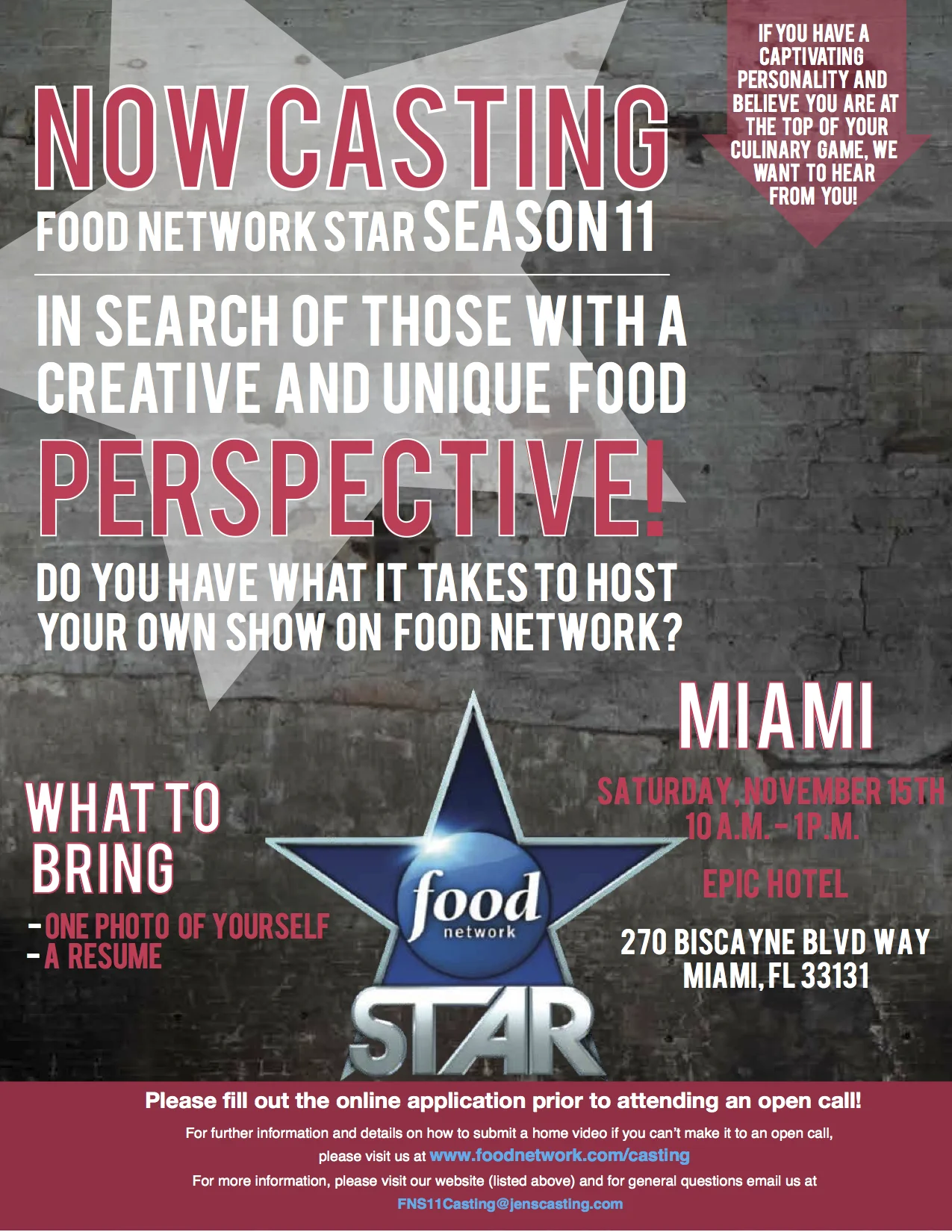 The Food Network is currently casting for season 11 and holding an open casting call in Miami on Saturday, November 15th!