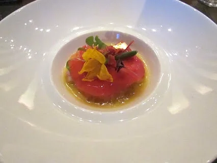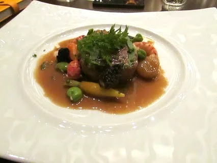 Being a fan of all things bubbly, I found it difficult to control my excitement with the evenings sparkling lineup. The overture to the meal, an open faced lobster ravioli with fresh local grapefruit topped with compressed watermelon with cilantro and basil, sang beautifully. In between the bites of the clean sea and bright citrus flavors, Chef Gervais added white balsamic spheres, the perfect note of acidity. Poured alongside the ravioli was the Gold Label Brut 2004 vintage. The spicy notes of the wine and structure on the long finish paired wonderfully with the bright, crisp dish.