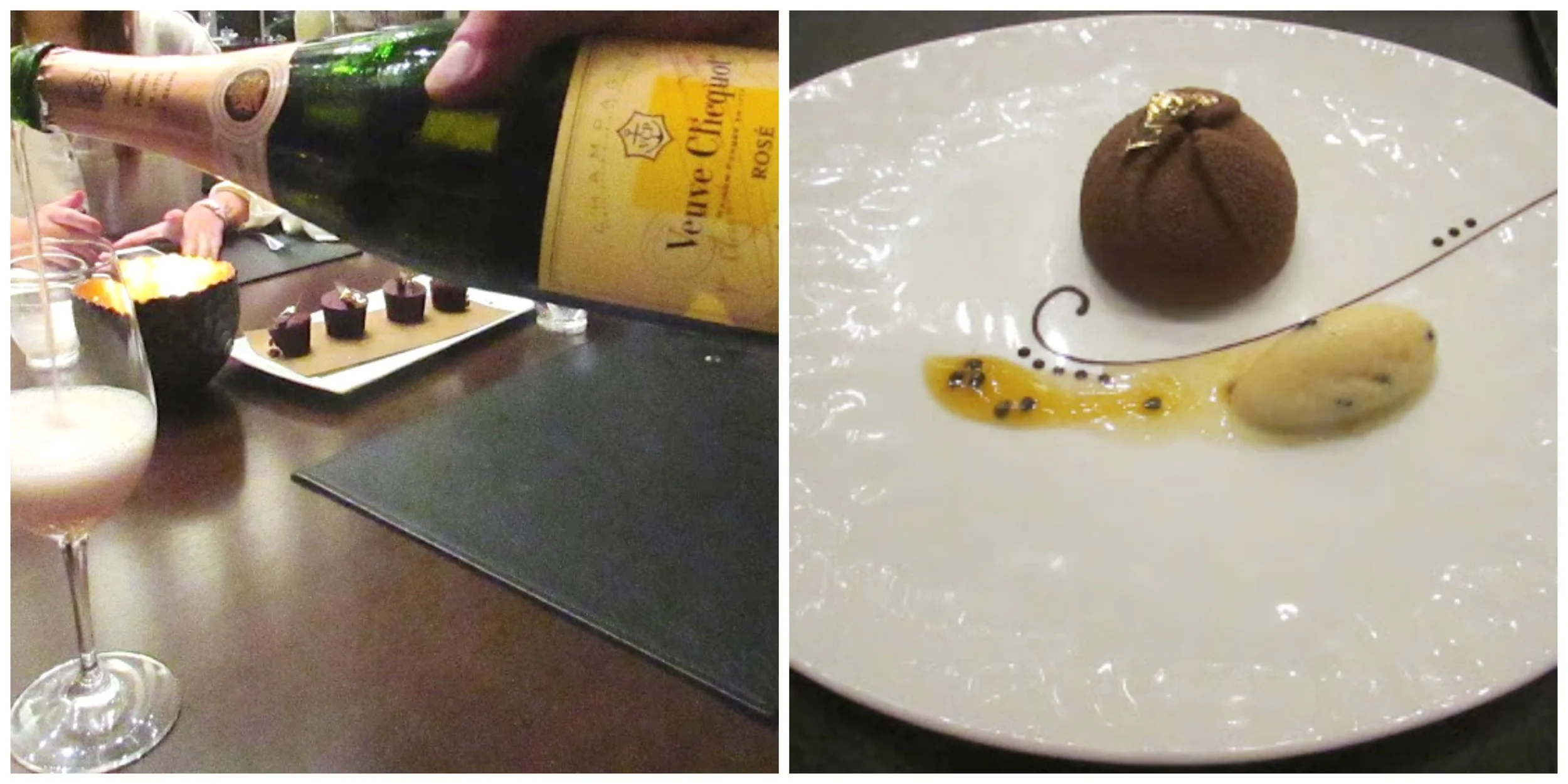 We concluded the evening with a flurry of desserts paired with a demi-sec champagne. The demi-sec style of champagne is a wine that contains a higher residual sugar level. Veuve’s has 46 g/L. Savoie served the wine from a decanter, an untraditional way to serve champagne. Savoie explained his reasoning for decanting the demi-sec, “by decanting this wine, because it is a wine, it will open up and reveal its full depth and range of flavors.” After taking a sip (then gulp), I understood why Savoie chose to decant the sweeter-style champagne. The decant allowed the bubbles to be exposed to more oxygen, enhancing the sweet, almost praline quality. A wonderful end to an exceptional dinner.