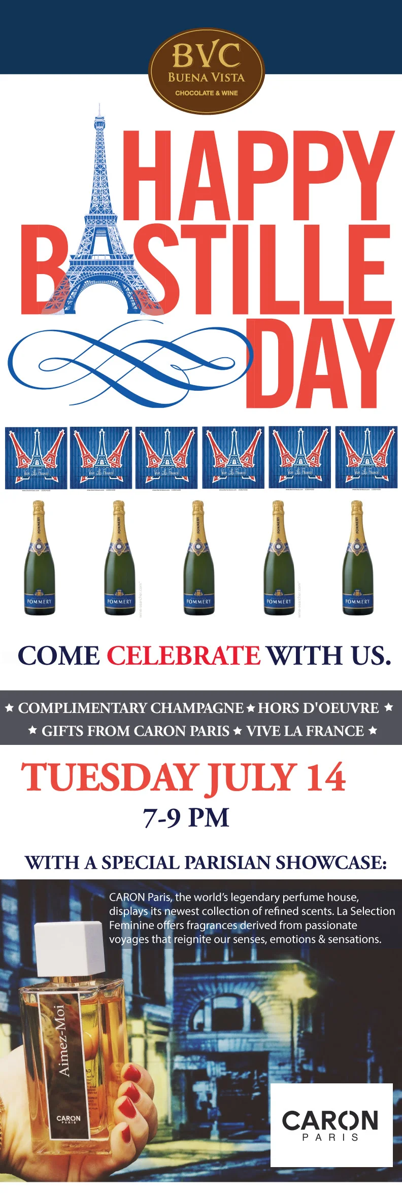 PS: Buena Vista Chocolate & Wine is hosting a special dinner for Bastille Day (7/14) with a free wine tasting, hors d’oeuvres and other surprises, from 7 pm - 9 pm. Don’t miss it!