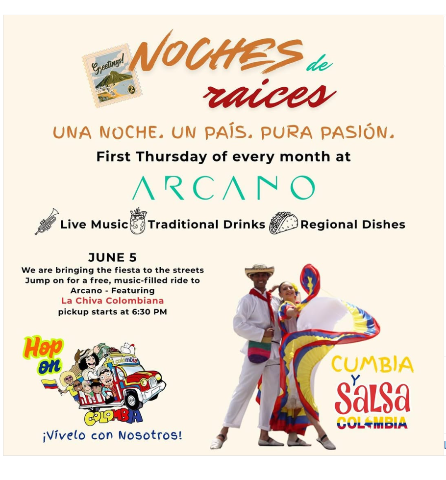 Coming up this Thursday, June 5, is Noches de Raíces, celebrating Colombia with live cumbia and salsa performances, plus a special appearance by La Chiva Colombiana! The festivities start at 6:30 PM with a music-filled Chiva ride through Coral Gables, free and open to all. Expect traditional bites, tropical drinks, and an atmosphere bursting with rhythm, color, and joy..