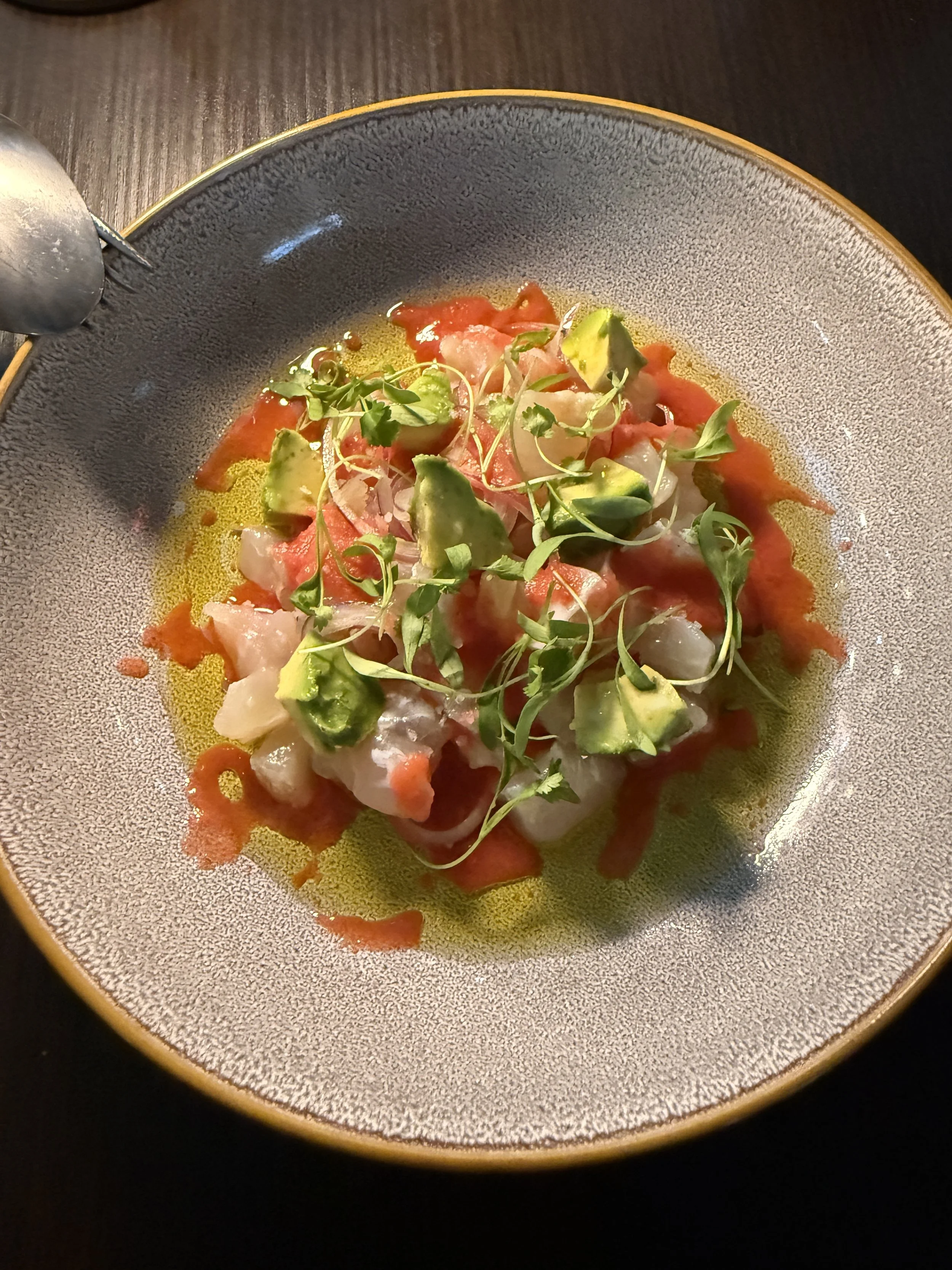 We kicked off our meal with a Ceviche, made with fresh Corvina and served in a vibrant strawberry leche de tigre. The flavor was unlike any ceviche I’ve had before. It was sweet, citrusy, and refreshing. It came with crispy, homemade malanga chips that were almost too pretty to eat but, of course, we devoured them.