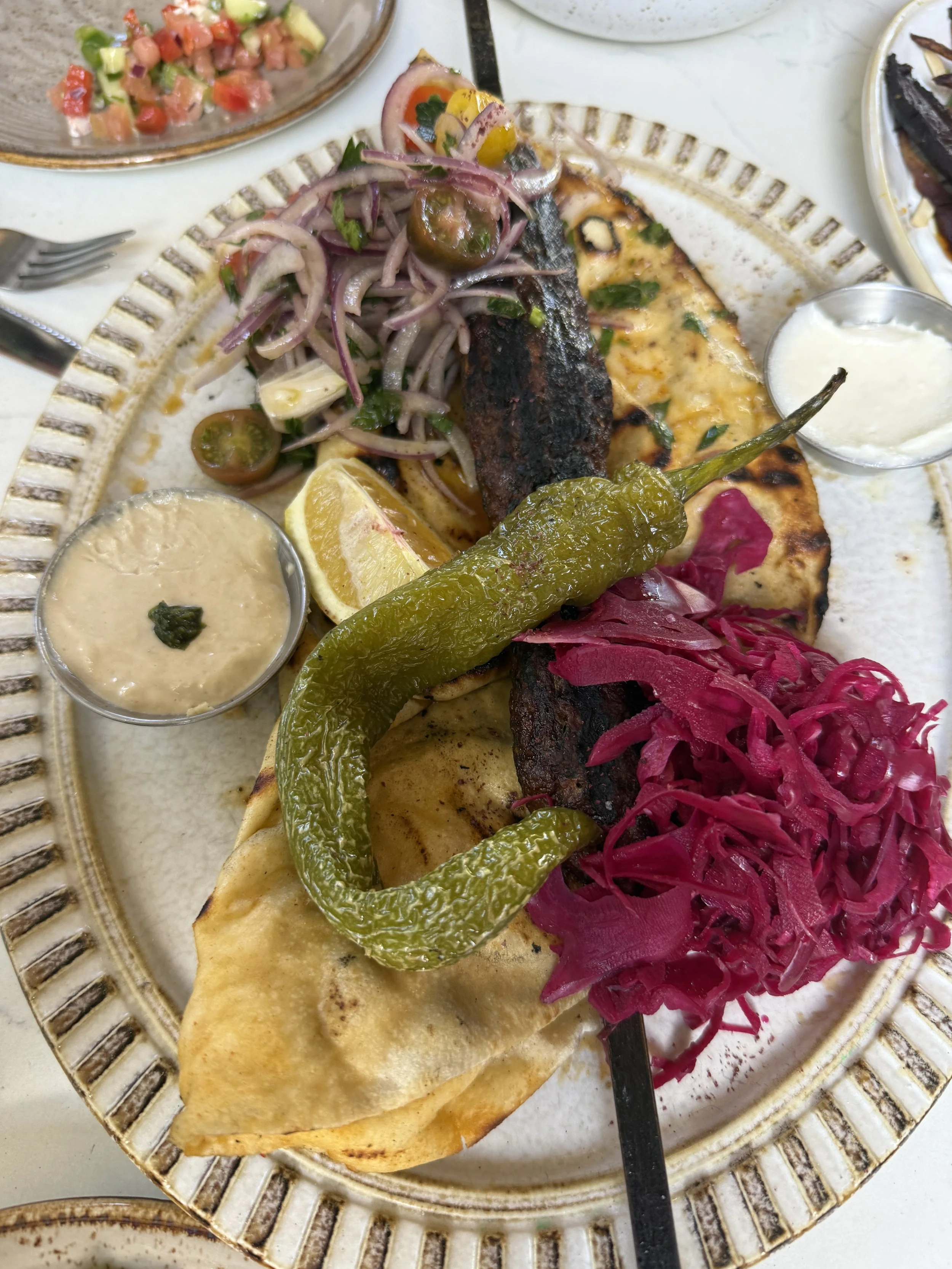 The Spiced Lamb Kefta skewered Shashlik came with charred laffa, pickled cabbage, cherry tomato, red onion, fresh herbs, toum, and lemon. Colorful and delicious, it was easily shared.