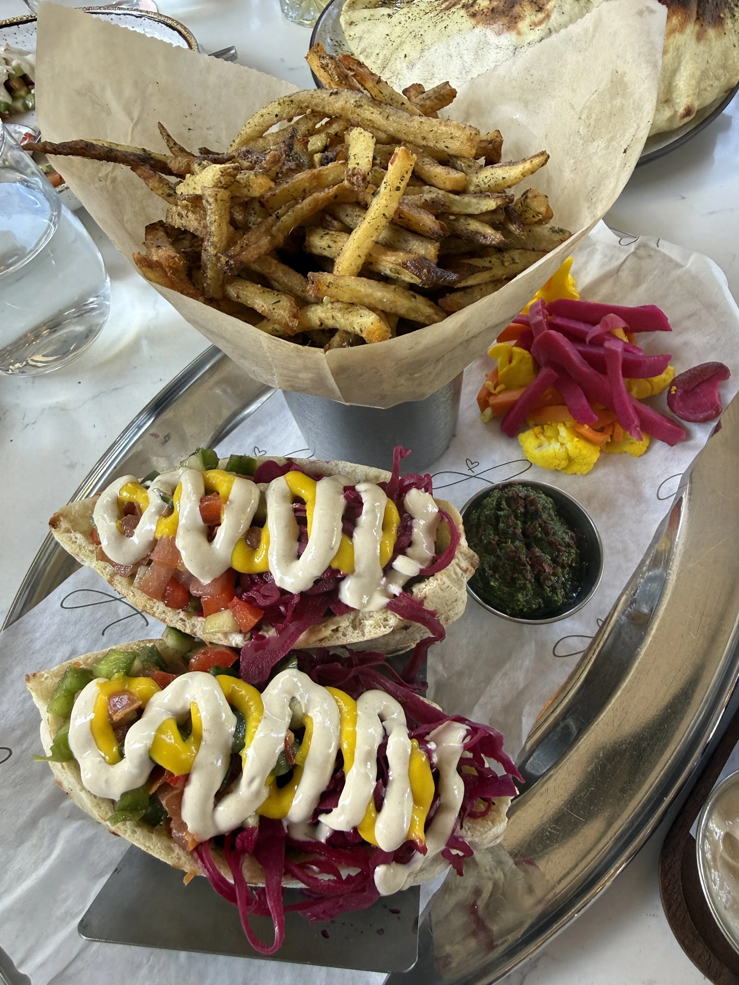 For our main lunch dishes, we settled on the Falafel pita sandwich which came as two overstuffed halves with shuk salad, hummus, pickled cabbage, tahini, amba, in a fire baked pita, with side of abbalé’s pickles and crispy fries.