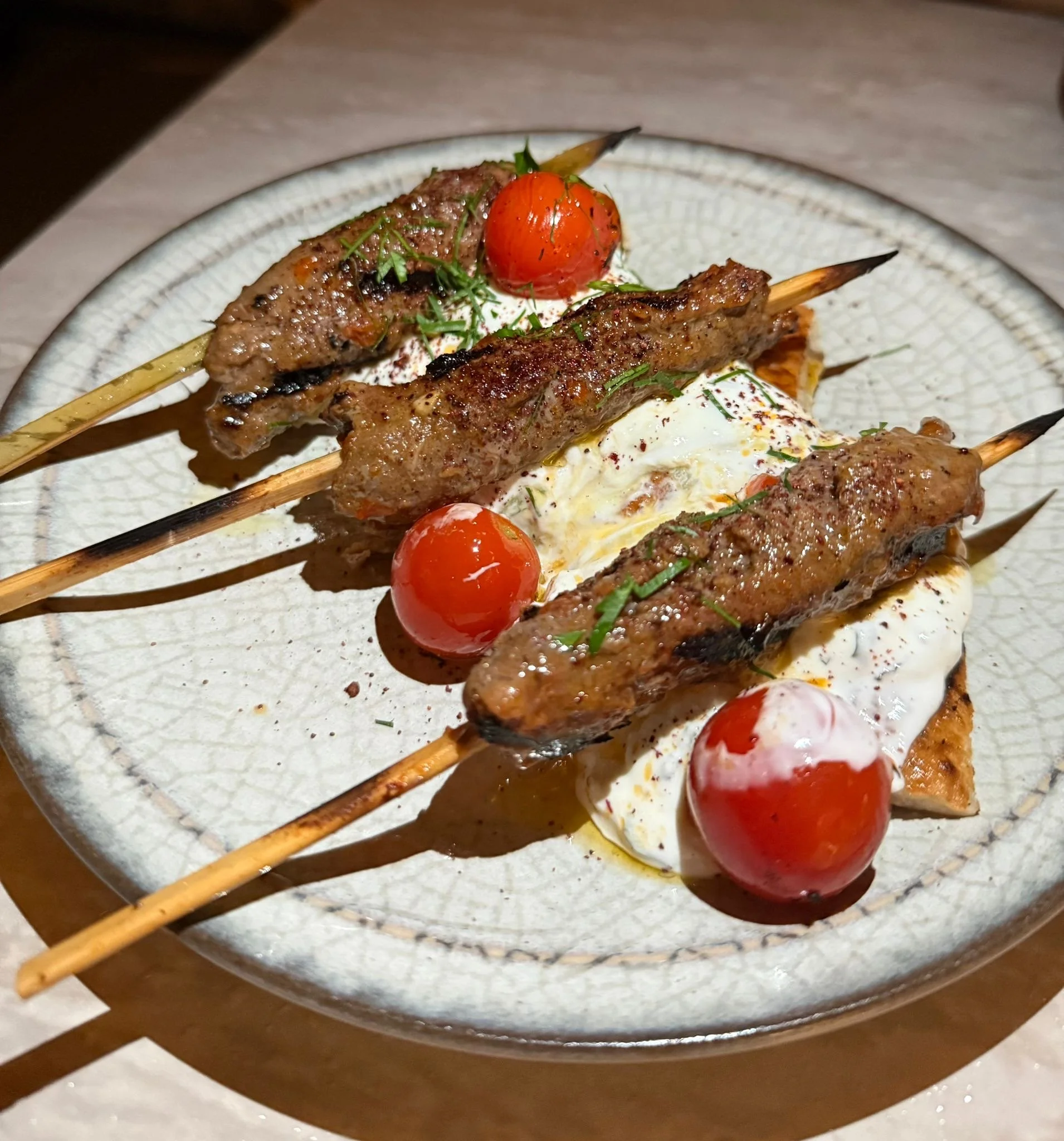 Kofta Skewers with tzatziki and charred tomatoes were juicy and fragrant with spice.