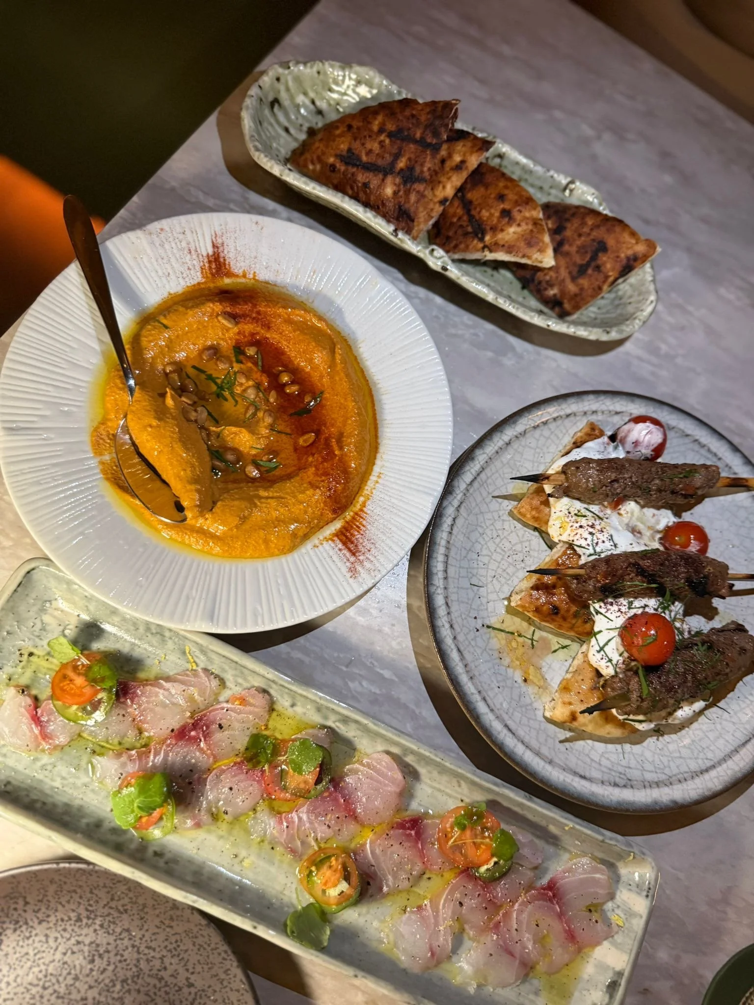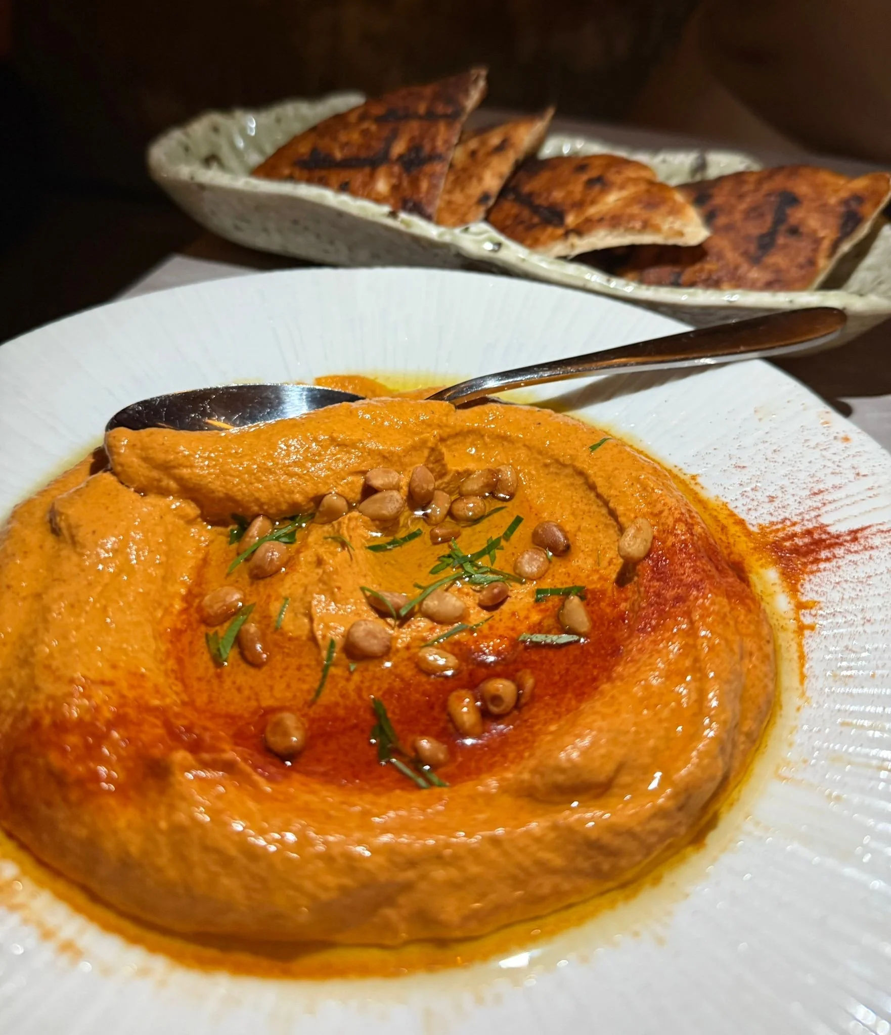 The food more than holds its ground against the glamorous backdrop. Starters are vibrant and shareable. We wanted to order the entire starter section, but restraint (and the promise of dessert) won. Our picks: Whipped Roasted Eggplant with bell peppers, pine nuts, and warm pita was velvety and bright.