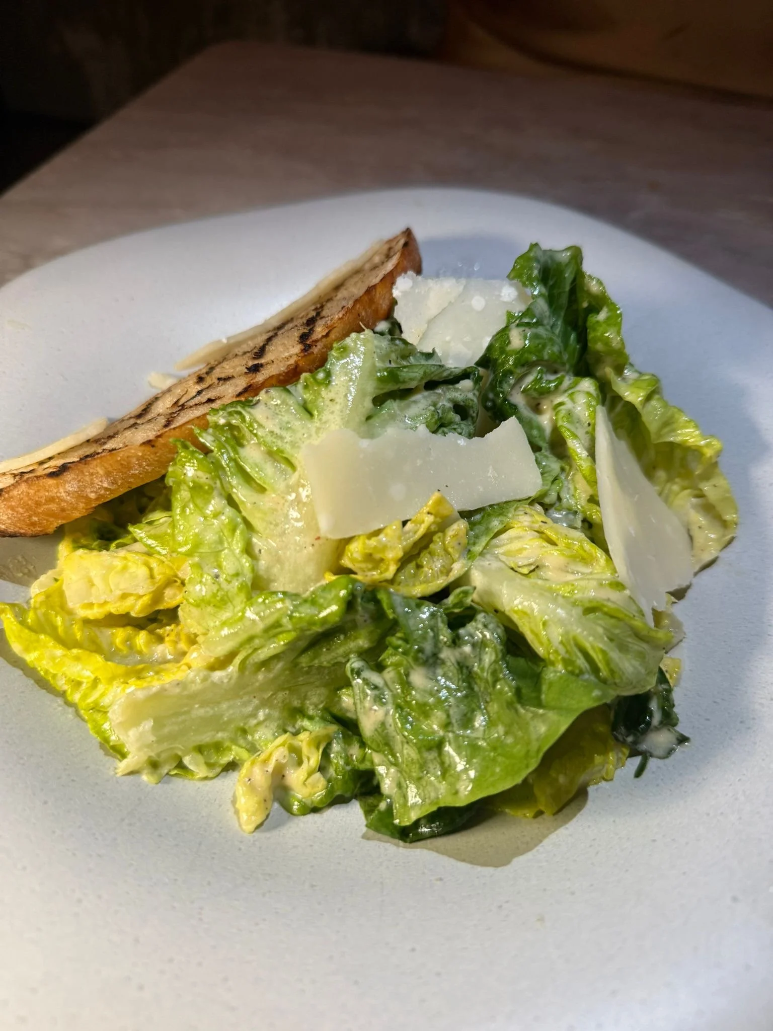 Caesar Salad with Parmigiano Reggiano, Cantabrian anchovies, and focaccia croutons, a Mediterranean-kissed take on a classic.