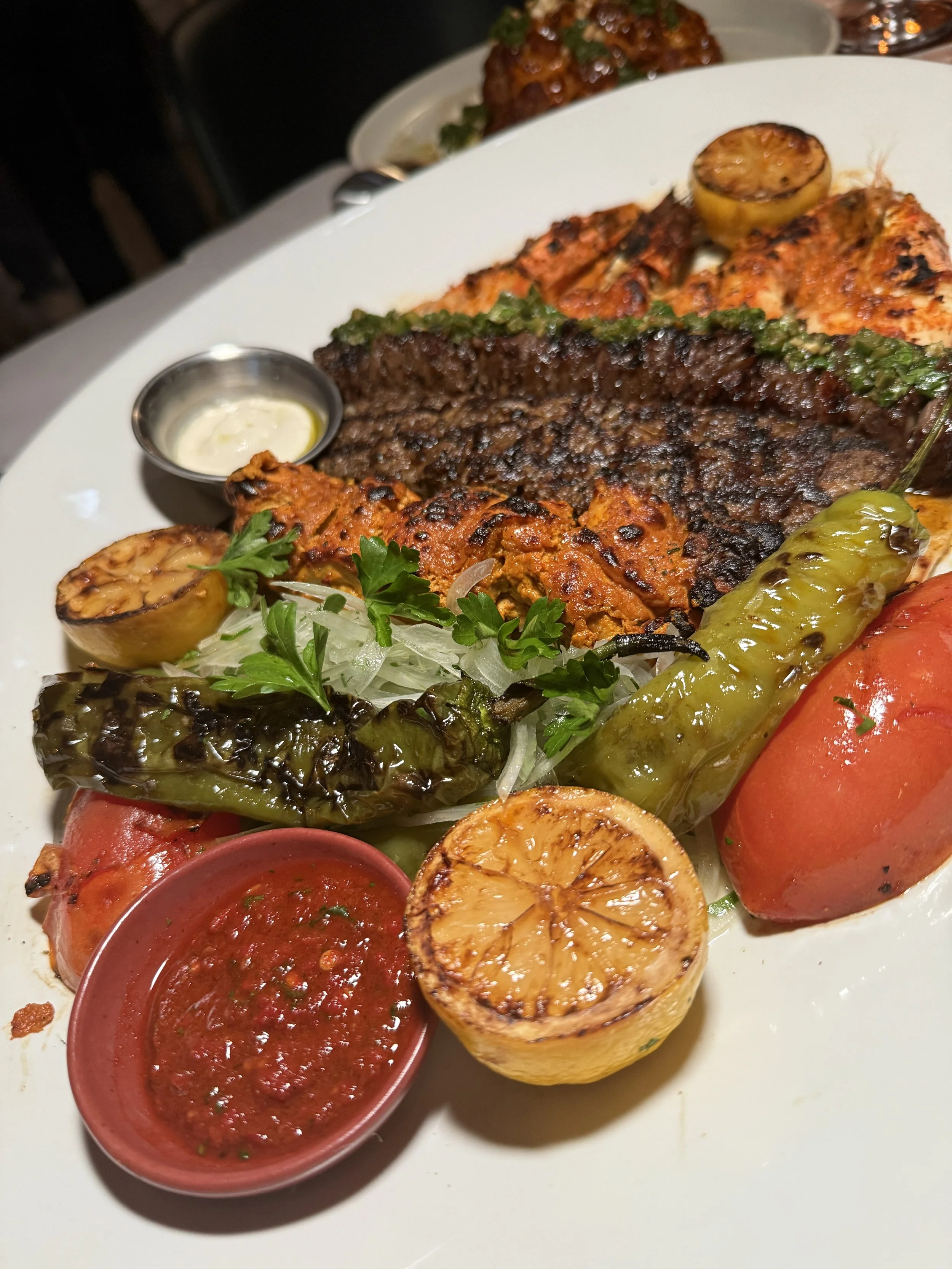 It featured a perfect blend of proteins and flavors and included Spiced Marinated Chicken, Ground Butchers Lamb Kofte, Marinated Beef Skirt Steak, Grilled Prawn skewer, and colorful grilled red peppers, Shishito peppers, tomatoes and lemon halves. There were 2 dipping sauces which we chose to ignore because the flavors were so well balanced.