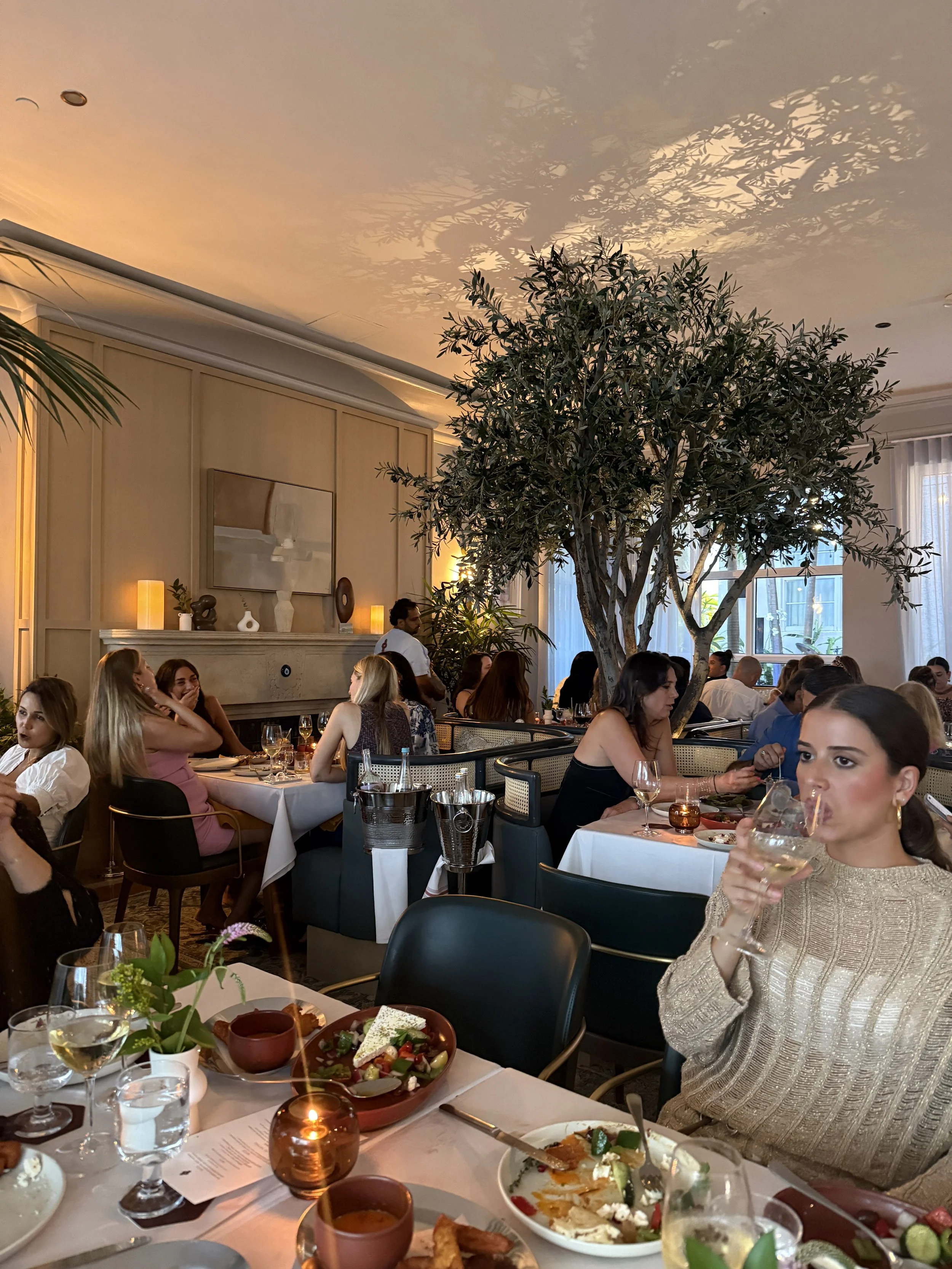 The main dining room is off the lobby with tables arranged around an olive tree and offers a warm and welcoming vibe.