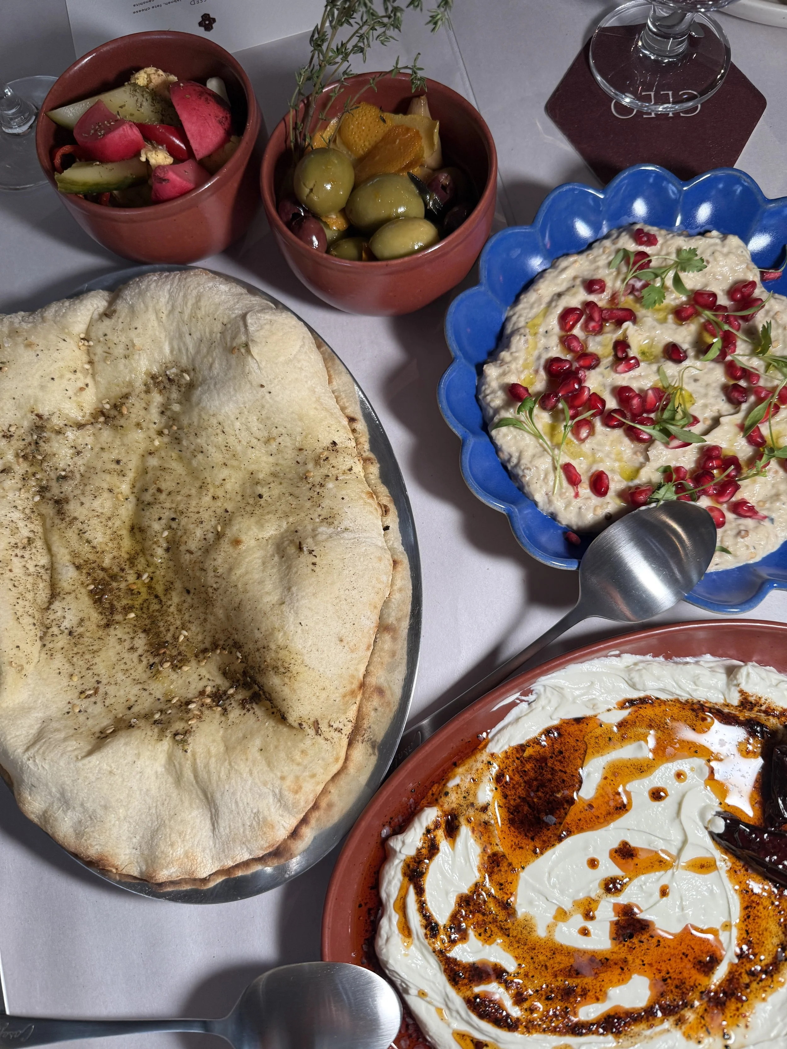 Once seated family style, we were presented with the first course of house baked jou jou pita, crudité, olives and pickled veggies, a selection of dips including Atom garlic yogurt and chili oil, Moutabel charred eggplant, Hummus and our favorite the walnut muhammara of toasted walnuts, herbs and topped with pomegranate.