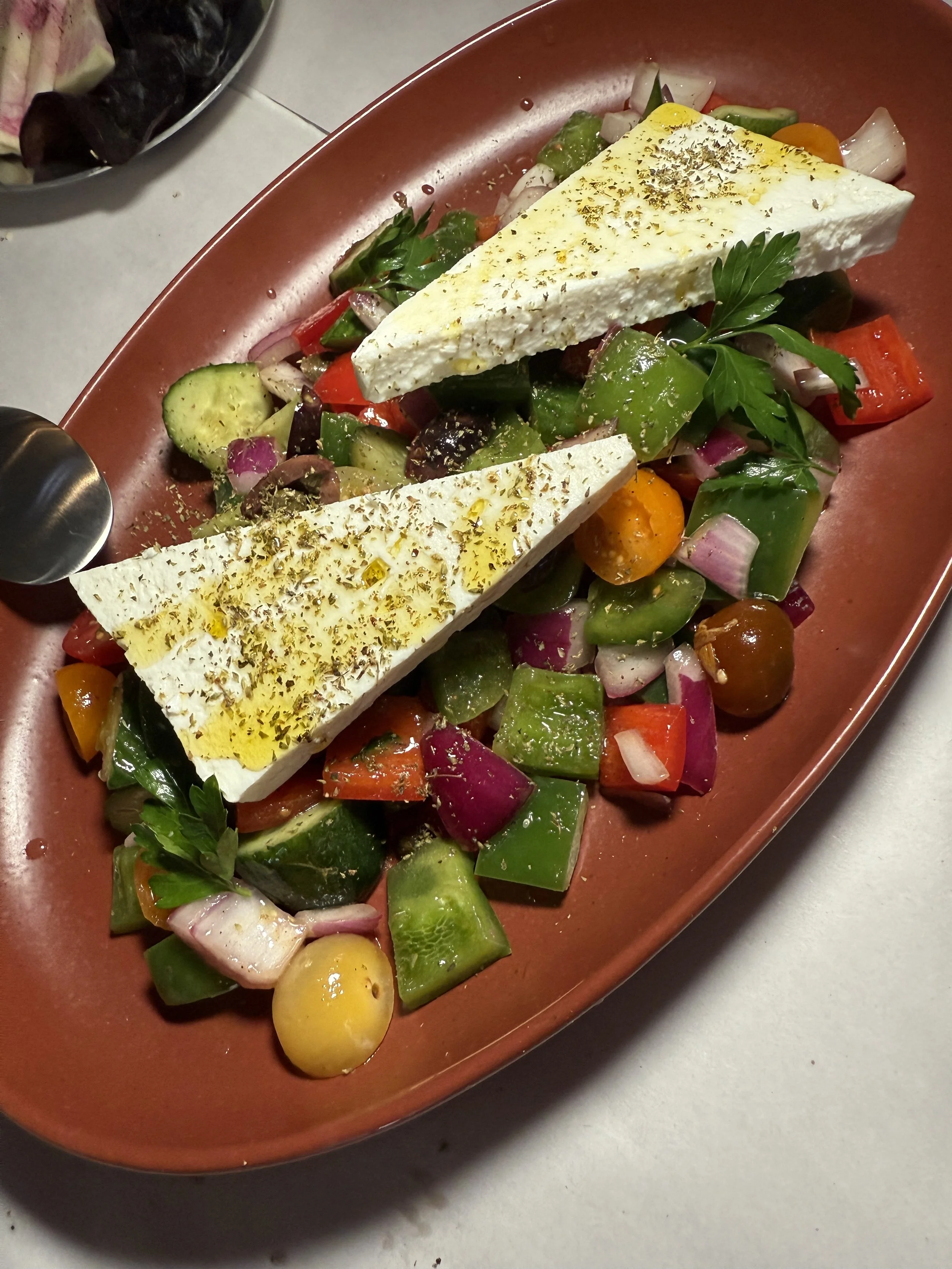 This was followed (and the timing and service was impeccable) by a colorful Greek Salad topped with large thick slices of feta and fried Halloumi. Cheese with a honey, lemon and chili dipping sauce.