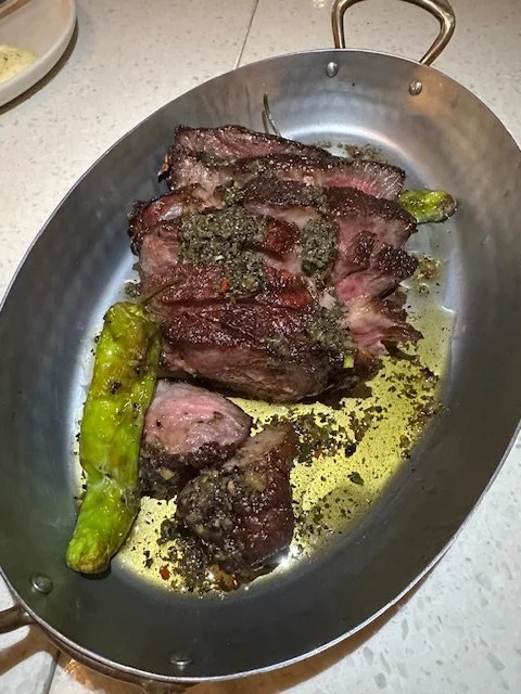 The next dishes came from the restaurant’s wood- and charcoal-fired ovens. The Prime Ribeye, nicely charred on the outside and melt-in-your-mouth tender, was perfectly complemented by a shishito pepper chimichurri that added brightness and gentle heat. The Spanish Branzino was simply prepared, with crisp skin and moist, tender flesh.