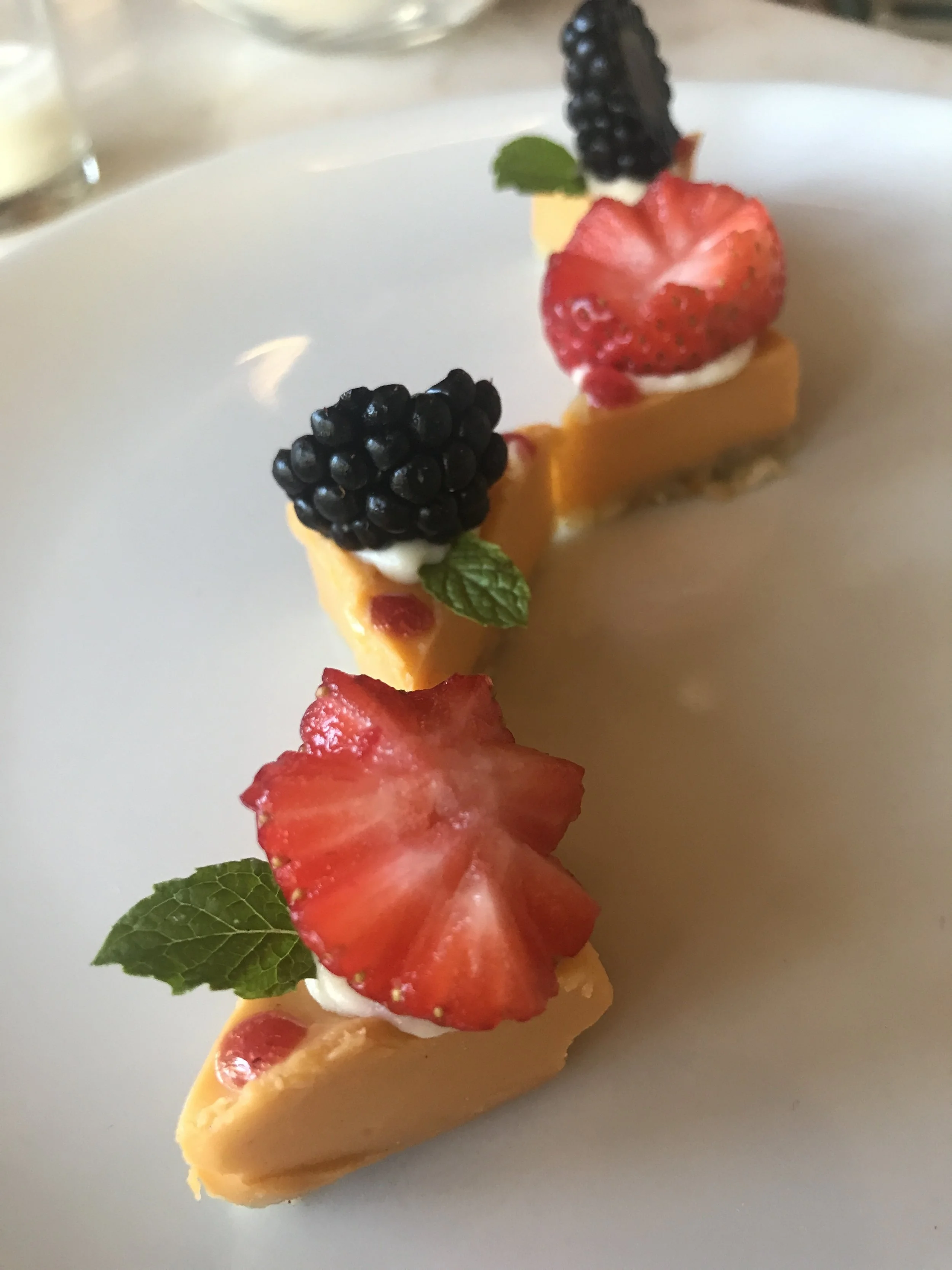 Miami Spice includes as third course a dessert and we chose a guiltless Seasonal Fruit Cheesecake with a crushed nut crust, lime curd, sorrel and gel. Light, colorful and refreshing, this dessert was a nice way to end a truly special meal. Another option was an Almond Pana Cotta with Mango, puff Amaranth, lime syrup and mint.