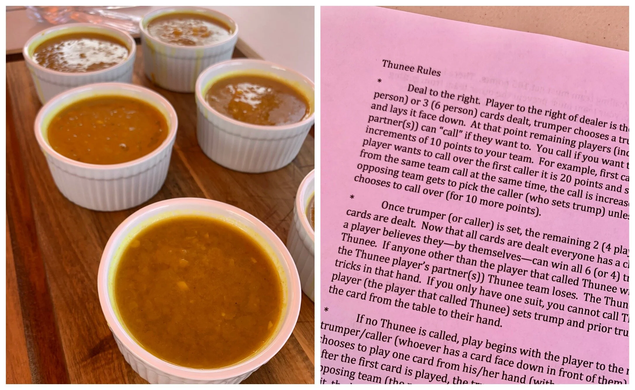 Our second course of Kik Alicia (yellow split-pea stew) from Ethiopia accompanied a card game from Africa, Thunee. That’s right…our friends responsible for games researched African card games online, found Thunee, learned the game, and even rewrote the game directions as cheat sheets for us when they deemed the web instructions too confusing.