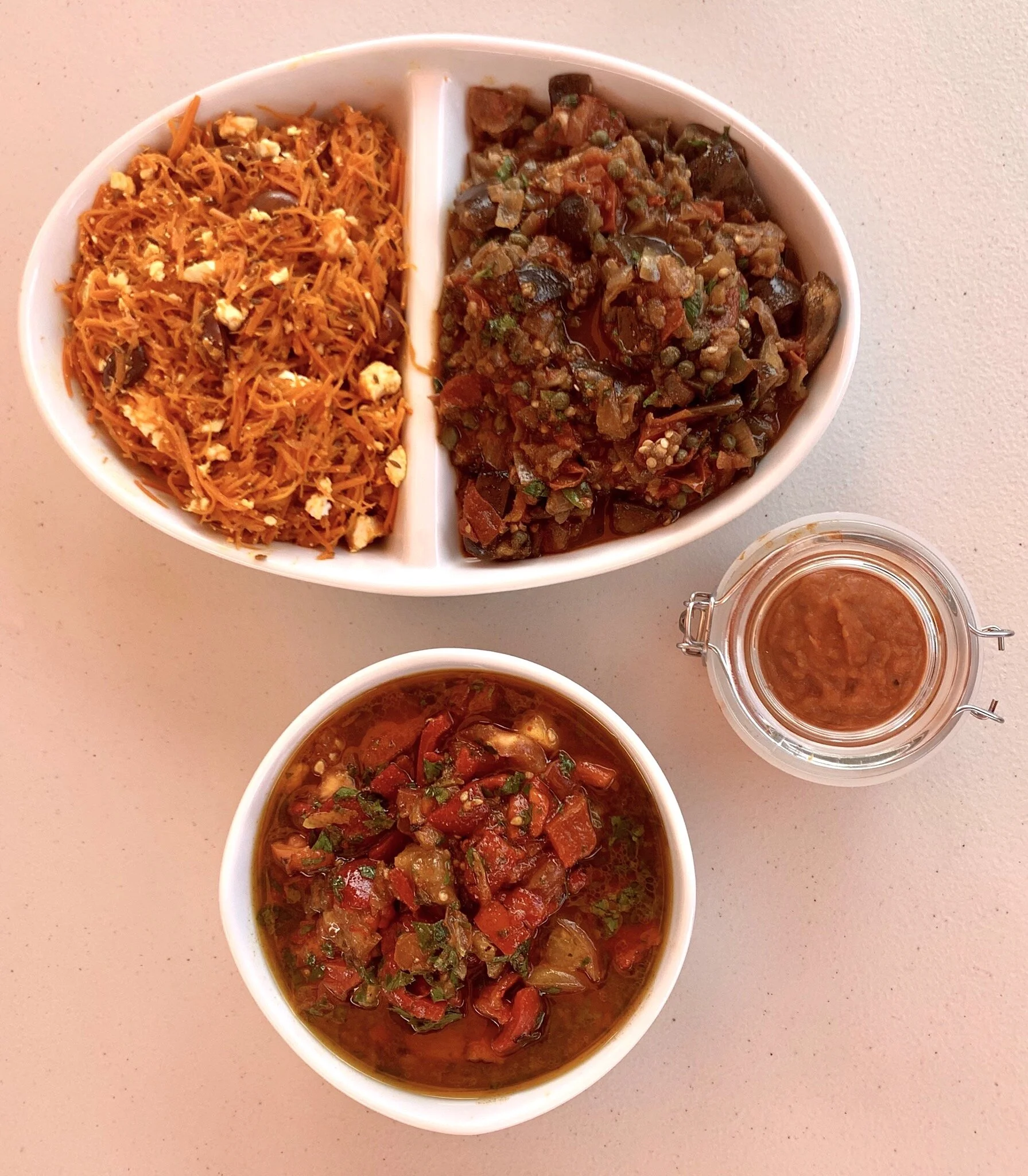 For the main course, we crisscrossed the continent in order to check off the boxes for North, South, and East. We served boerewors sausage and homemade chapati alongside three North African salads: grilled eggplant, roasted red pepper with preserved lemon, and spicy carrot.