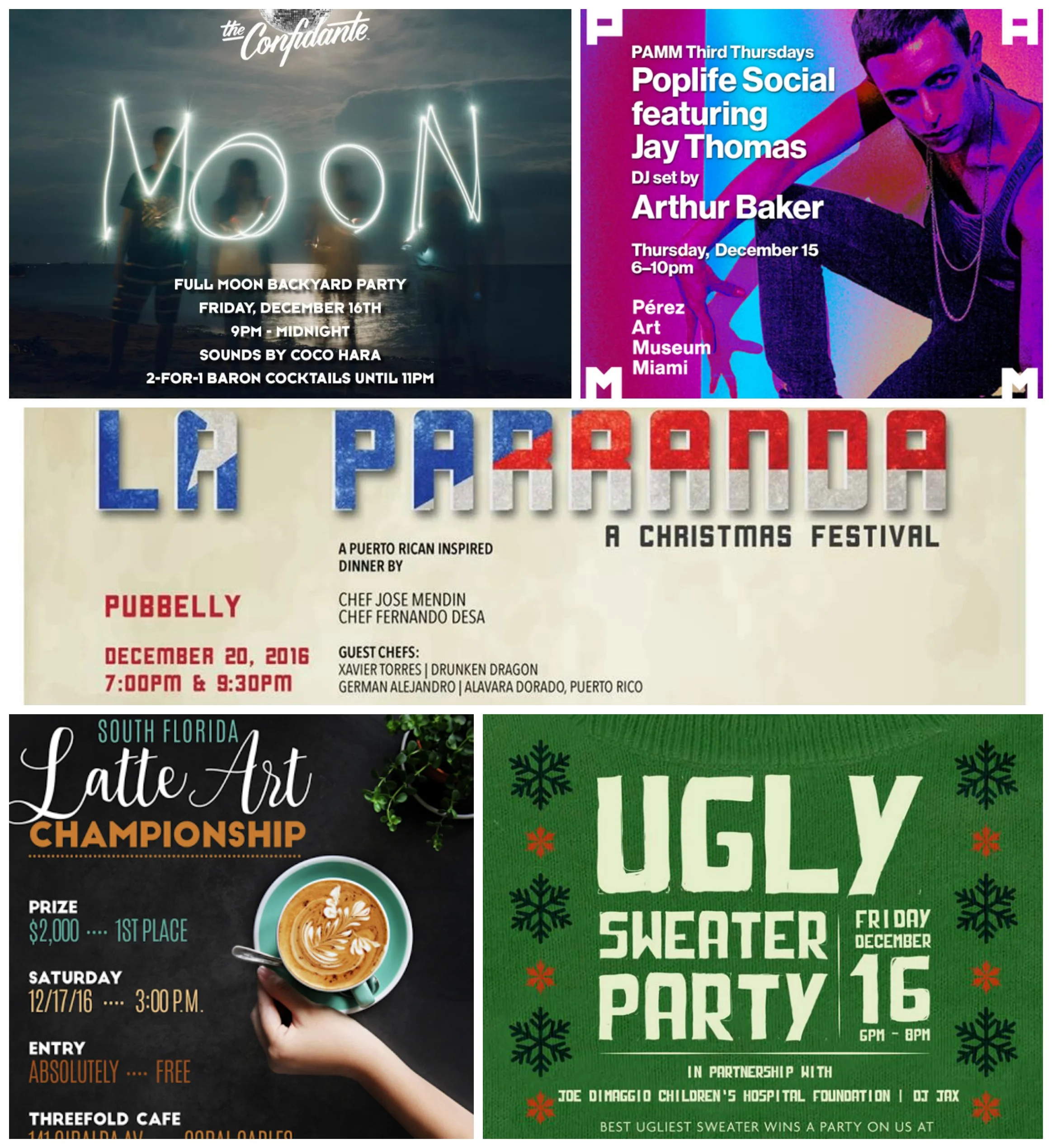 Saturday December 17th- It’s The Latte Art Championship Finals! Hosted by Now Brewing and friends and boasting talented and creative baristas from Panther, All Day, Cafe Curuba, Threefold and more competing to be crowned Latte Art Champion and take home the $2000 Grand Prize. Stop in beginning at 3 pm to see the fun and caffeinated final competition for 2016. FREE. Threefold Café 141 Giralda Ave. Coral Gables